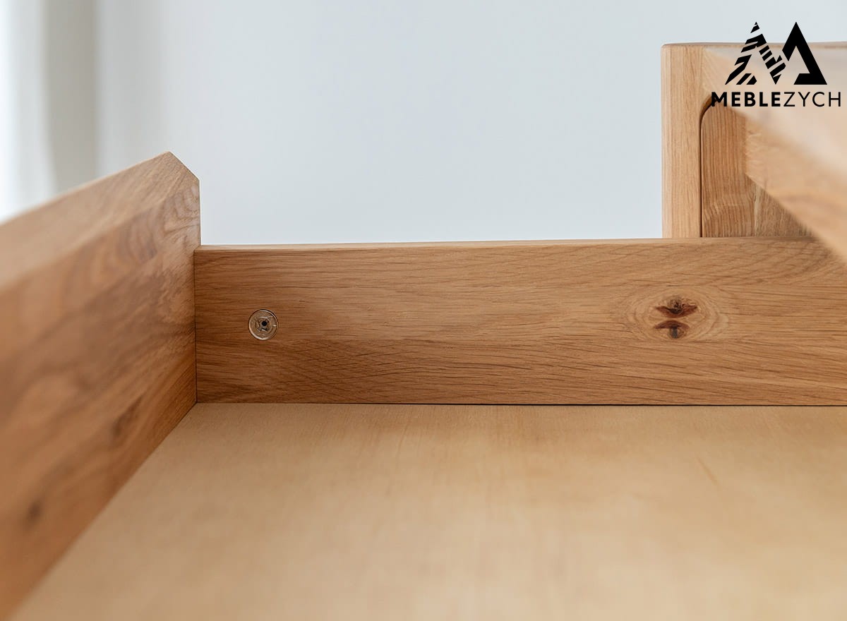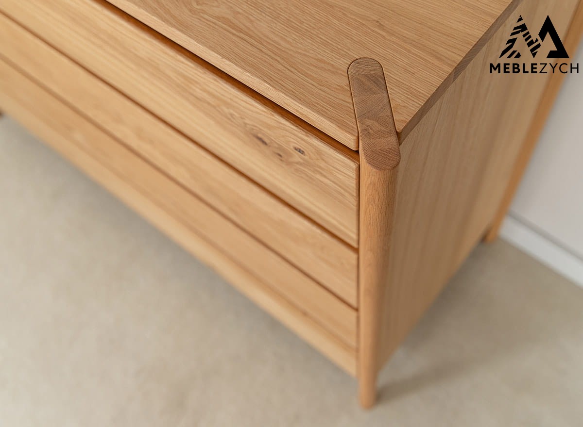 Komodę tworzy jeden z najlepszych surowców naturalnych – 100% litego dębu – drewna, które z czasem i przez kolejne dekady użytkowania staje się jeszcze piękniejsze. Na wytrzymałość mebla wpływają także aspekty techniczne; jak powierzchnia zabezpieczona olejem Borma o półmatowym wykończeniu, który nie dość, że pięknie wygląda, to też świetnie się czyści. Wpuszczone uchwyty natomiast odpowiadają z jednej strony za czystość formy, ale z drugiej za praktyczność, na którą wpływa również cichy domyk szuflad. Sprawia on, że codzienne użytkowanie staje się ciche i płynne – dosłownie.