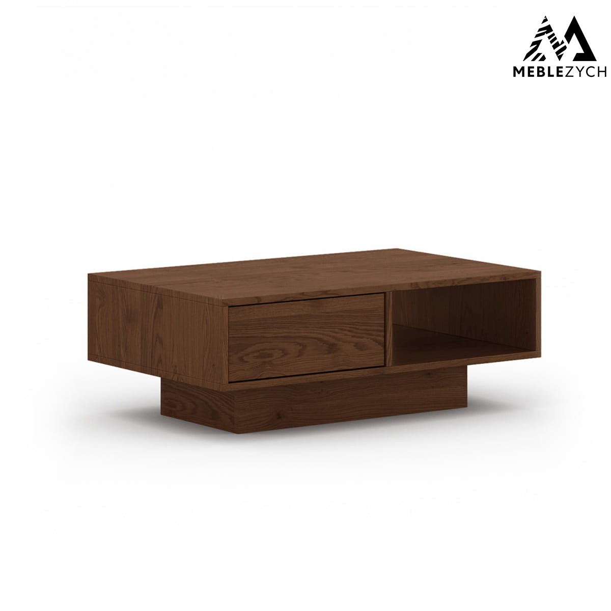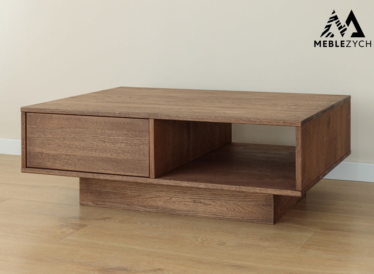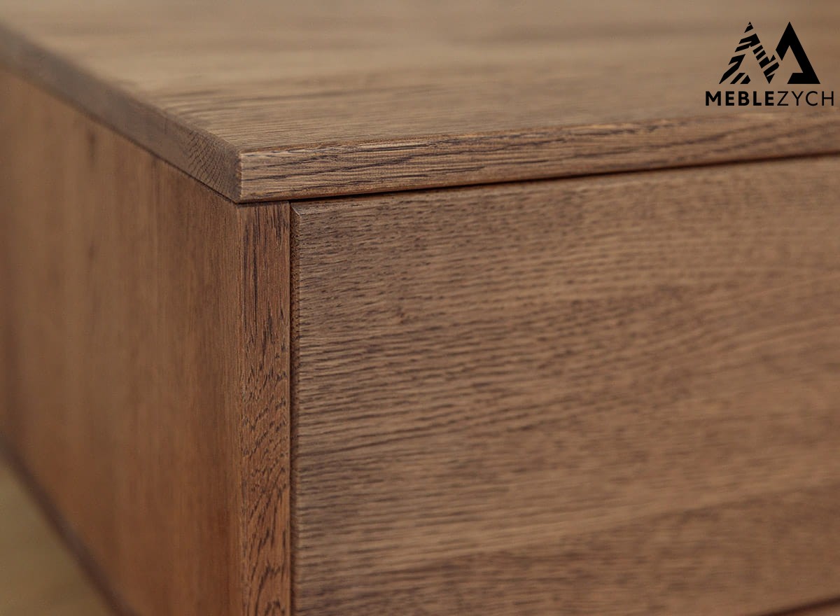 Również solidność czuć w każdym detalu. Dębowe drewno jest odporne na uszkodzenia, a olejowana powierzchnia przed śladami codziennego użytkowania. Szuflada, ukryta pod blatem, otwiera się lekko i cicho, służąc za praktyczne miejsce na wszystkie drobiazgi, które chcesz mieć pod ręką. Otwarta półka dodaje przestrzeni na książki, gazety lub stylowe dekoracje.