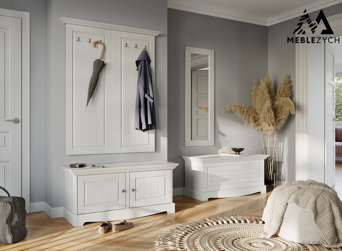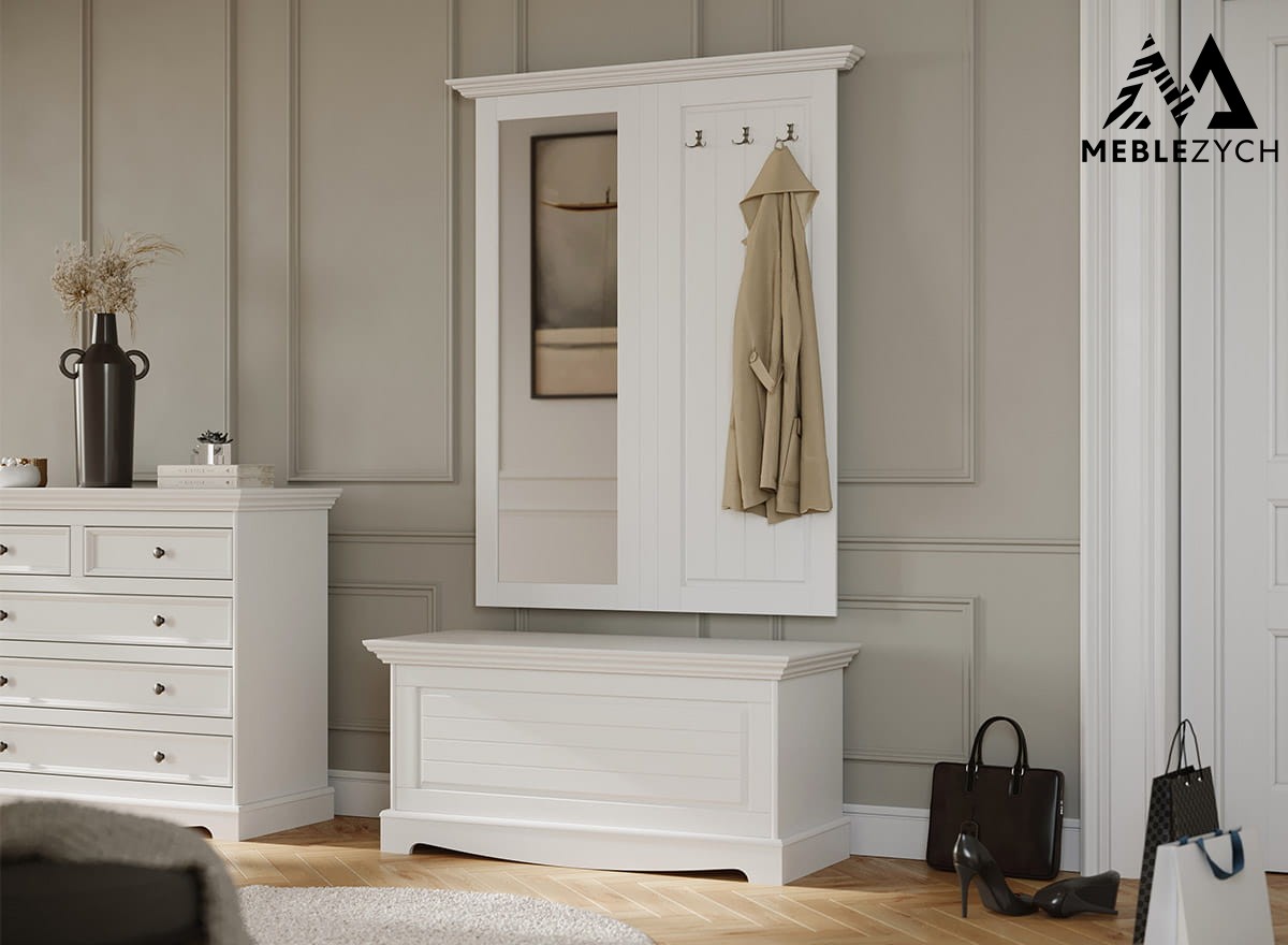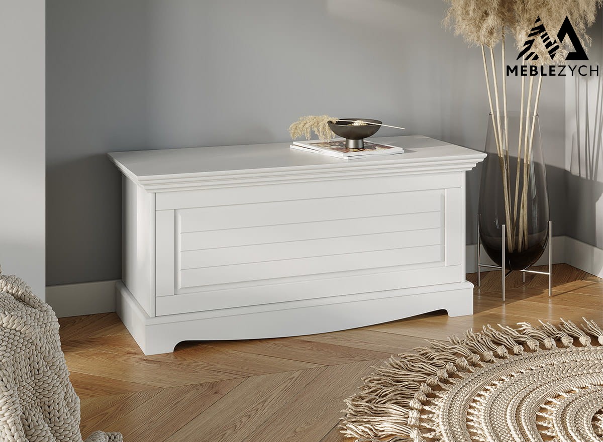 Drewniana skrzynia do sypialni lub przedpokoju w odcieniu ciepłej bieli