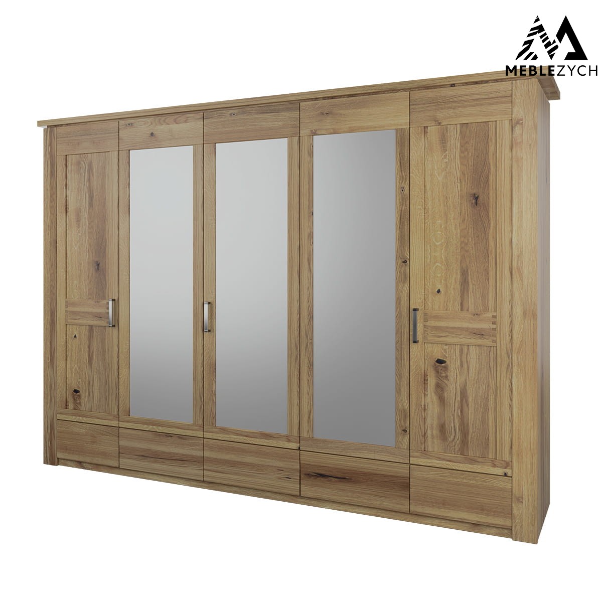 Pięciodrzwiowa szafa drewniana tworzy obszerną przestrzeń do przechowywania. W górnej części szafy z lustrem Lago zostały usytuowane solidne, dębowe półki, które doskonale sprawdzą się do przechowywania odzieży, dodatków lub pudełek z akcesoriami, po które sięgasz rzadko. W idealnej szafie nie mogło zabraknąć drążka, na którym zawiesisz koszule, sukienki lub płaszcze. Dzięki niemu ubrania nie pomną się i zawsze będą gotowe do wyjścia. Szafa 5D Lago została wyposażona w aż 3 lustra, umieszczone na trzech środkowych frontach. Ich obecność ożywia konstrukcję całego mebla, a dodatkowo optycznie powiększa i rozświetla pomieszczenie.