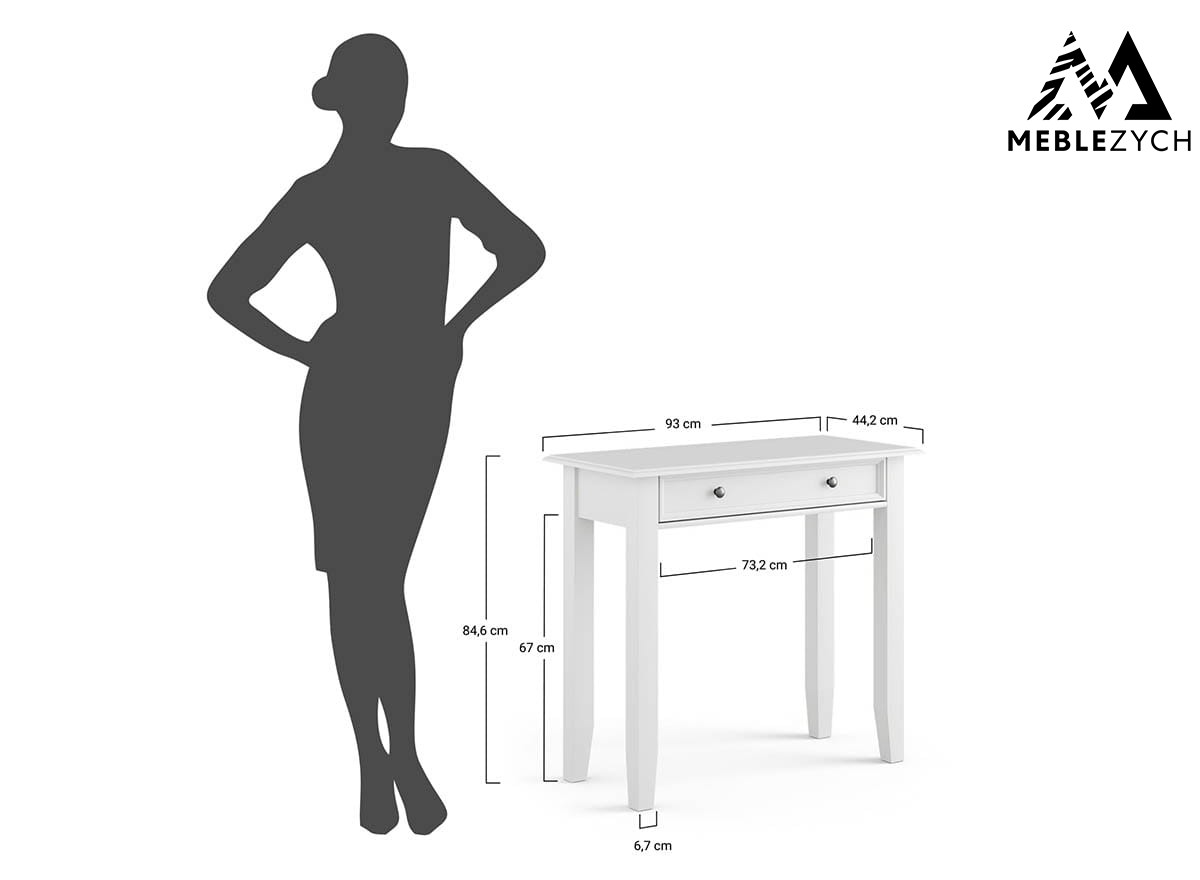 Kompaktowe wymiary – szerokość toaletki wynosi 93cm, wysokość zaś 85cm. Jej głębokość równa jest natomiast 44cm. Dzięki temu z łatwością urządzisz przy jej pomocy nawet niewielkich wymiarów sypialnię lub garderobę.