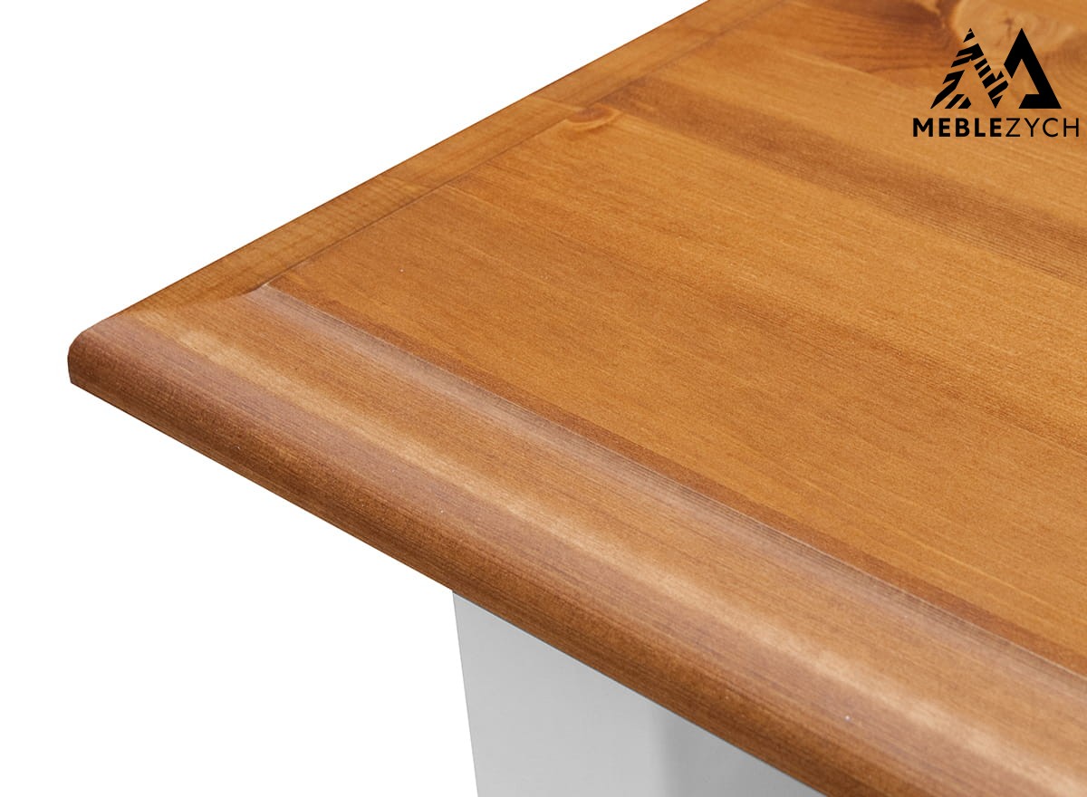 Blat toaletki oraz front szuflady zdobią subtelne frezy. Ich obecność podkreśla więź bryły z kolekcją Belluno Elegante oraz nadaje jej prowansalski charakter. Dodatkowo, nogi toaletki zostały zaprojektowane w taki sposób, by zwężały się subtelnie ku dołowi. Takie rozwiązanie sprawia, że toaletka sosnowa nabiera jeszcze więcej lekkości. Należy jednak podkreślić, że zabieg ten nie ma wpływu na stabilność mebla.