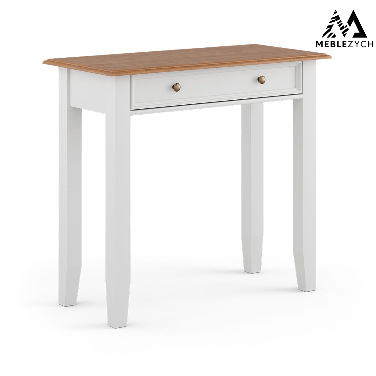 Toaletka Belluno Elegante biały-dąb została wykonana z litego drewna sosny fińskiej. Zastosowanie tego materiału jest gwarancją trwałości i wytrzymałości mebla. Pomalowana jest ekologiczną farbą wodną, której krycie utrzymuje się na poziomie 85%. To zaś sprawia, że rysunek słoi drzewnych oraz sęków pozostaje lekko widoczny pod jej powłoką. Dostrzegalna struktura drewna nadaje każdej sztuce niepowtarzalny charakter.