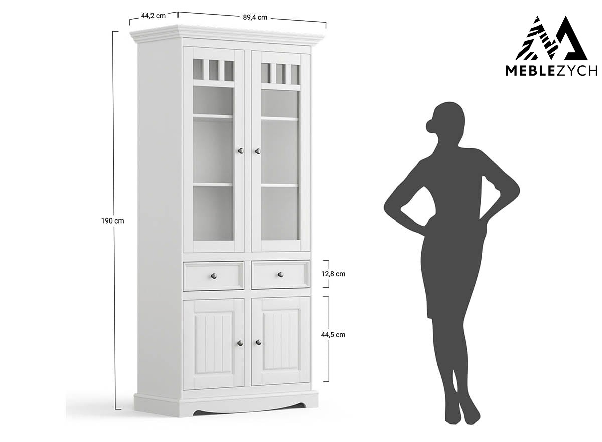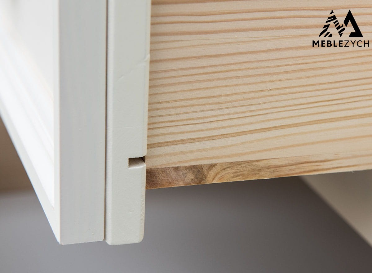 Witryna drewniana została wyprodukowana wyłącznie z materiałów najwyższej jakości. Drewno sosny fińskiej połączono z prowadnicami kulkowymi Quadro, które zapewniają ciche oraz delikatne wsuwanie i wysuwanie się szuflad, zapobiegając ich trzaskaniu. Są one również wyjątkowo trwałe. Aby biała witryna długo zachwycała swoim wdziękiem, dodano do niej srebrne, okrągłe gałki, dodające meblowi subtelnego uroku. Rzeźbiony cokół dolny jest jednocześnie elementem zdobiącym, jak i stabilizującym drewnianą witrynę
