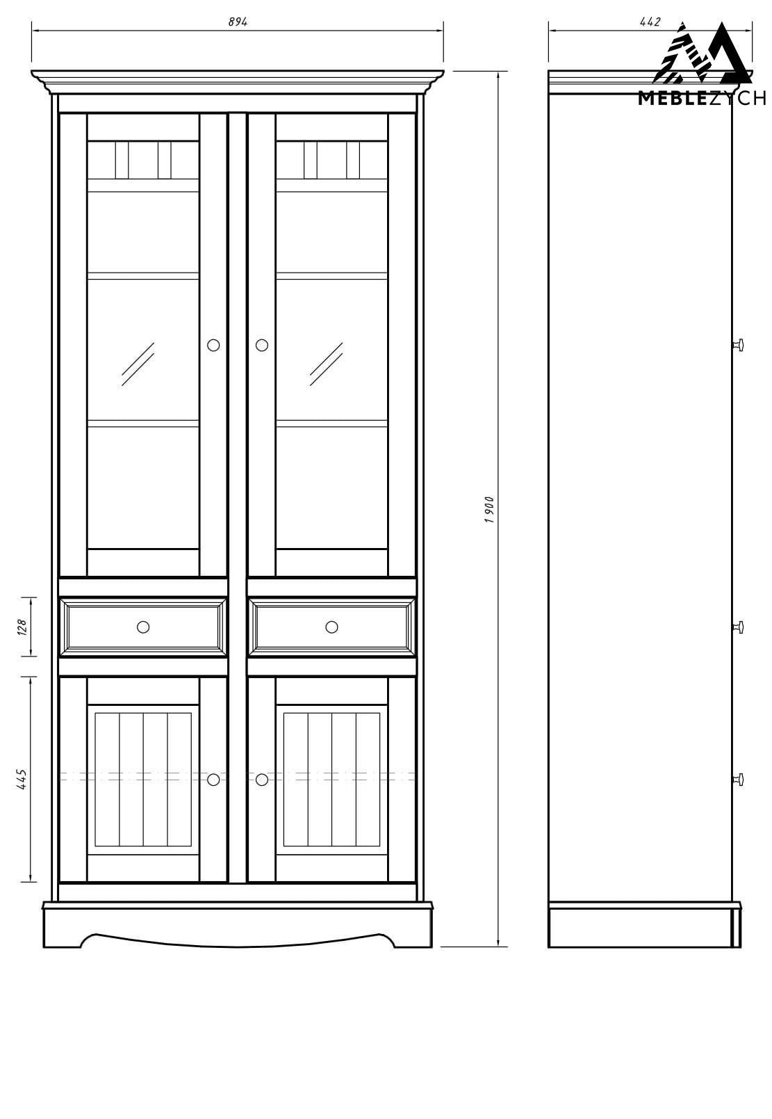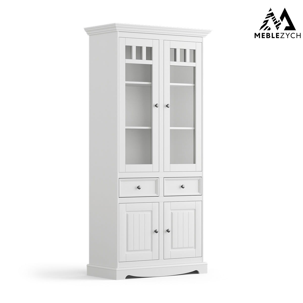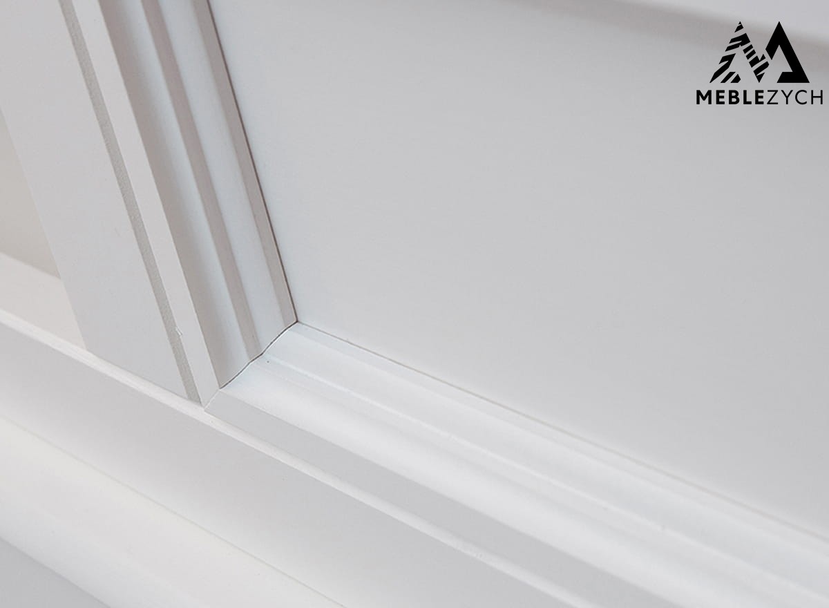 OZDOBNY COKÓŁ - wykorzystany przy produkcji sposób malowania w kolorze ciepłej bieli, delikatne gałki i subtelne przeszklenia to nie jedyne atuty witryny. Jest nim także bezapelacyjnie ozdobny dolny cokół.